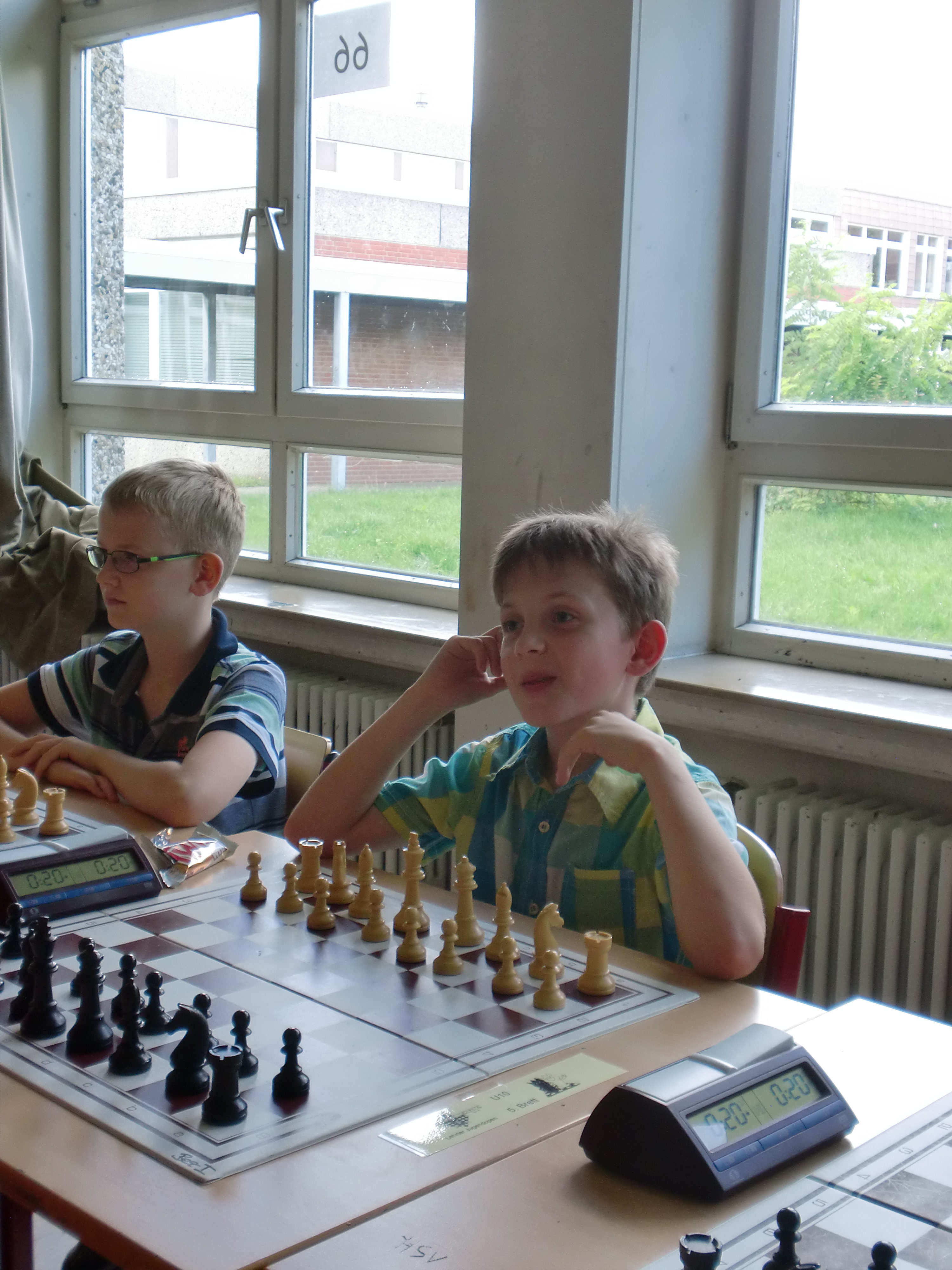 Nach leichten Anlaufschwierigkeiten, als er sich in der Favoritenrolle zunächst schwer tat, kam Max in der U11 immer besser in Fahrt und gewann in der letzten Runde vor der Mittagspause auch gegen seinen Dauer-Konkurrenten Diyar Bakiyev aus Mahndorf, der sich heute ausnahmsweise einmal mit dem zweiten Platz in der Endtabelle begnügen musste. Die gute Form konnte Max offensichtlich während der Pause konservieren und so strebte er in den verbliebenen drei Partien ungefährdet dem Turniersieg entgegen. Die Nerven spielten ihm glücklicherweise keinen Streich und auch meine größte Sorge, die Kinder mögen beim Toben auf dem weitläufigen Schulareal den Rundenbeginn verpassen, bewahrheitete sich nicht. So durfte ich Zeuge werden, wie Max, dem in der letzten Runde bereits ein Remis genügt hätte, um uneinholbar in Führung zu bleiben, seinen Gegner nach exakt vier Minuten bereits mattsetzte. Sensationell!